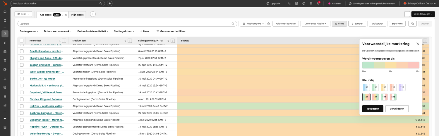 • Visuele signalen: Gebruik voorwaardelijke markeringen om trends en problemen in één oogopslag te zien. Zie het voorbeeld in ons demo account hieronder: