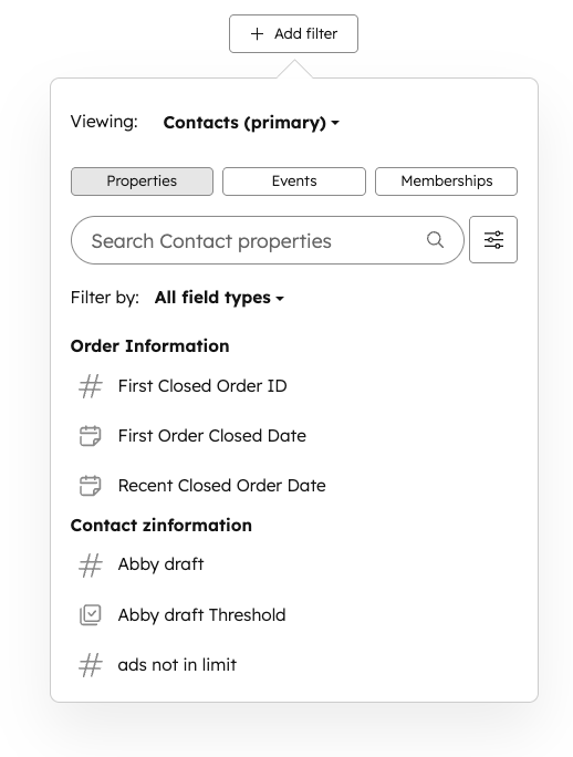 - Verken filters georganiseerd in drie tabbladen: Eigenschappen, Gebeurtenissen en Lidmaatschappen. Om andere objecten te filteren, selecteer je het object bovenaan.