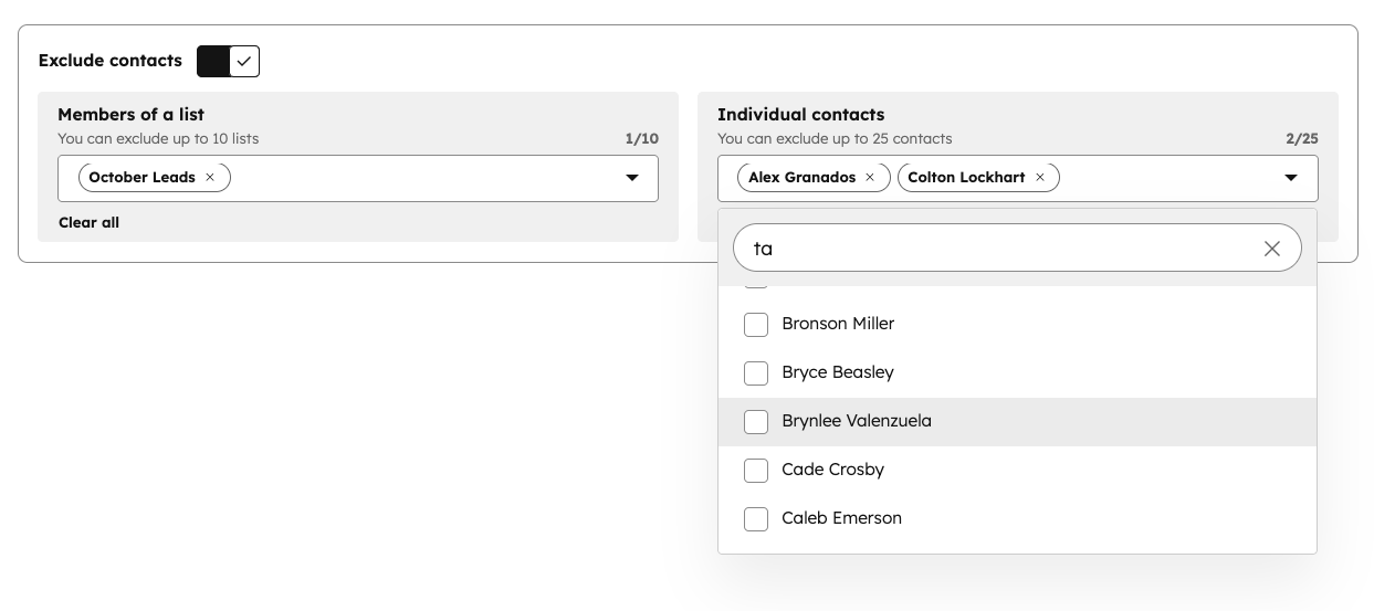 - Selecteer vervolgens de individuele contacten of statische segmenten die je wilt uitsluiten.