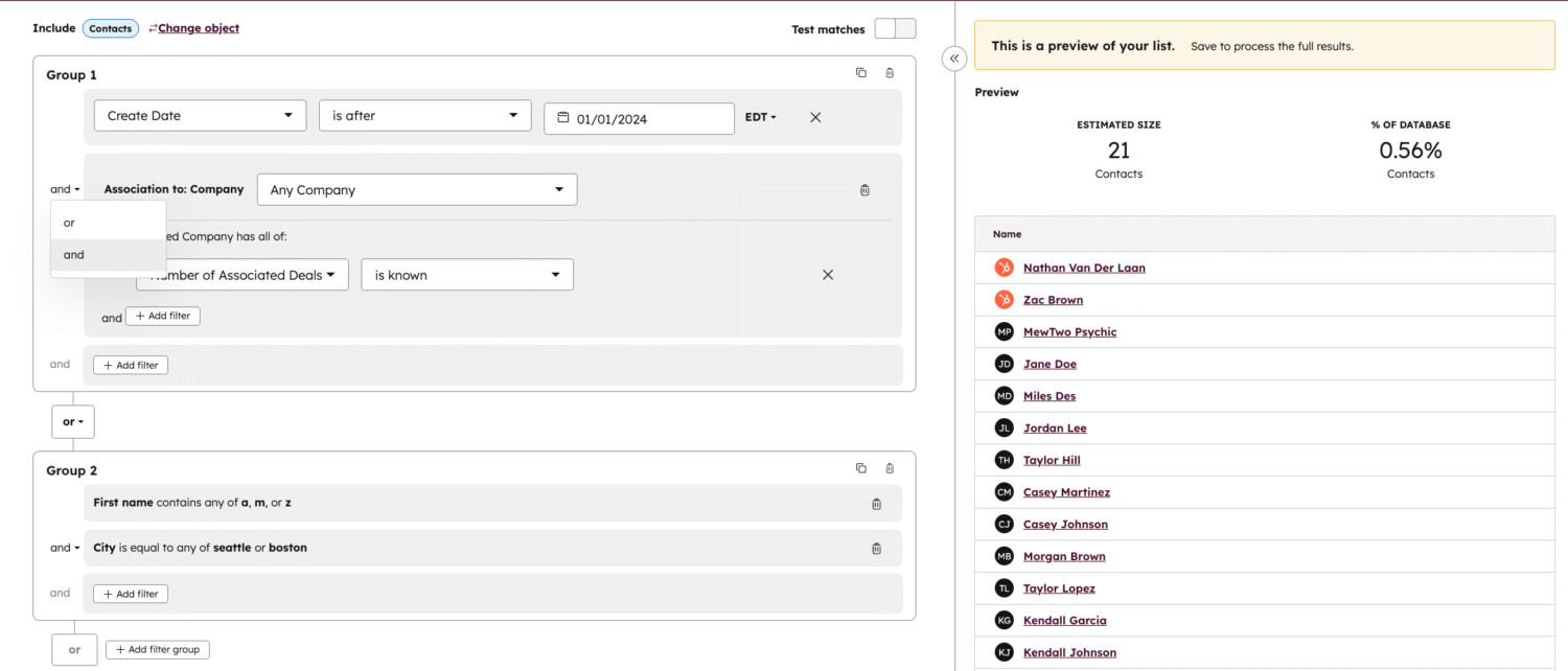 - Wil je dit wijzigen? Klik eenvoudig op de OF-schakelaar tussen groepen om een dropdown te openen en over te schakelen naar EN. Deze dropdown is altijd beschikbaar, zodat je de logica op elk moment kunt aanpassen.