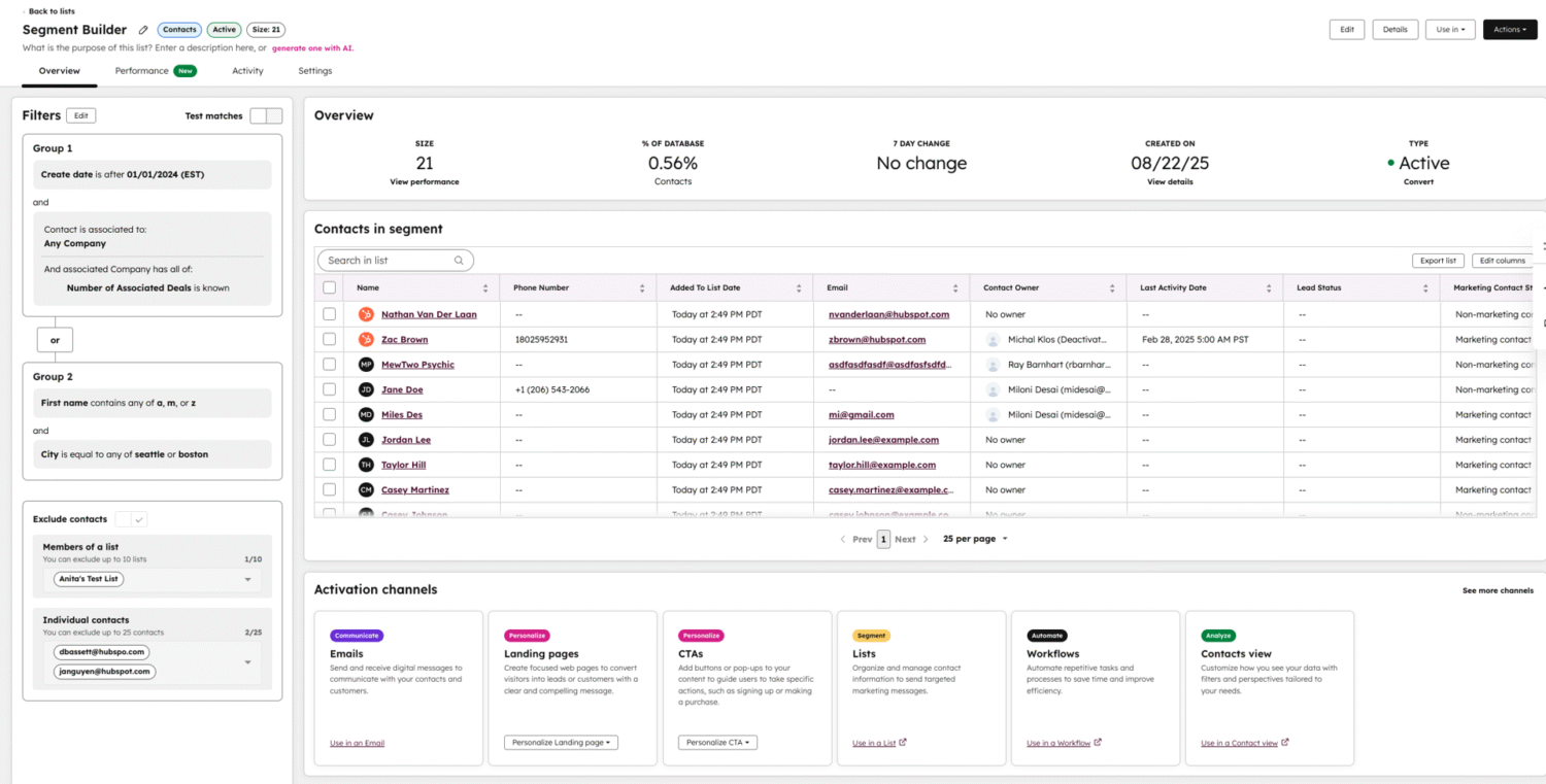 Je krijgt ook duidelijke suggesties over hoe je je segment kunt inzetten, of dat nu is om een e-mail te verzenden, een landingspagina te maken, CTA’s toe te voegen of workflows op te zetten.