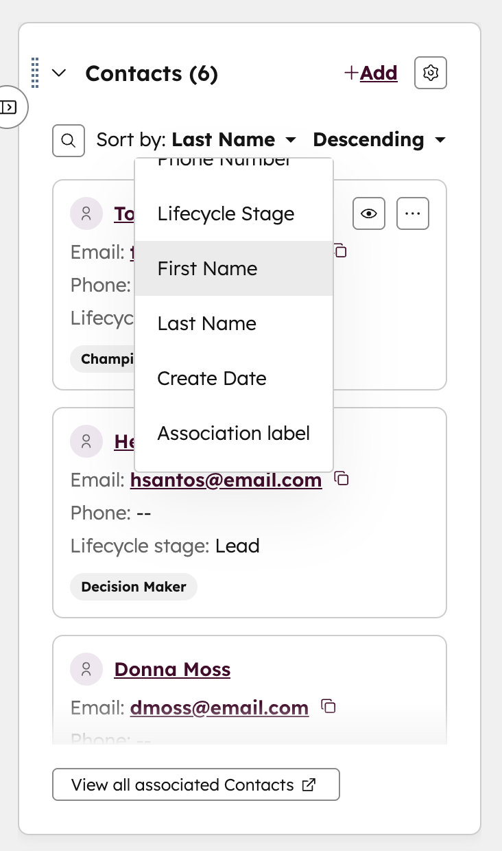 Associatiekaarten ondersteunen nu sorteren, zoeken, meer weergave-eigenschappen en inline scrollen op geassocieerde objecten voor gemakkelijkere navigatie. Deze verbeteringen verhogen de productiviteit door het makkelijker te maken om geassocieerde records te vinden, te organiseren op labels en belangrijke details in één oogopslag te zien.